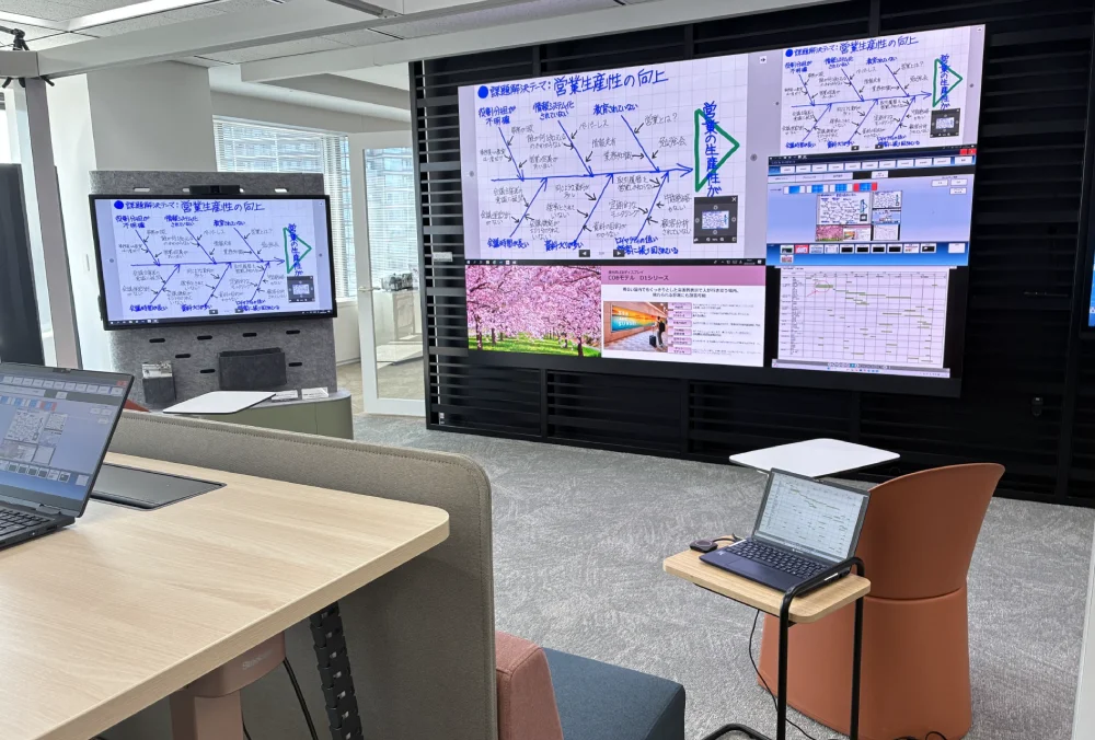 大型LEDディスプレイ、電子黒板をフレキシブルに活用することで、偶発的な対話が生まれ、創造的なアイデア共有やコラボレーション作業ができる場。
