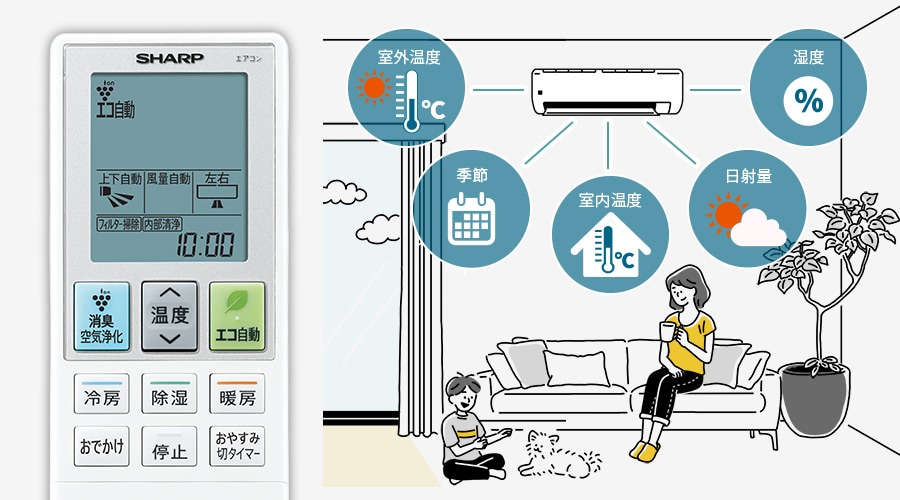 ボタン1つで節電※1運転。日差しや湿度、季節までも判断して快適性に配慮しながら、効率のよい運転に自動で制御します。