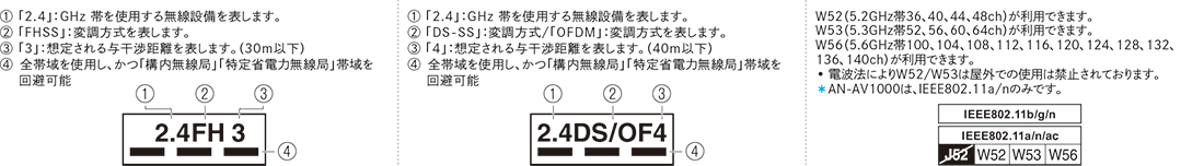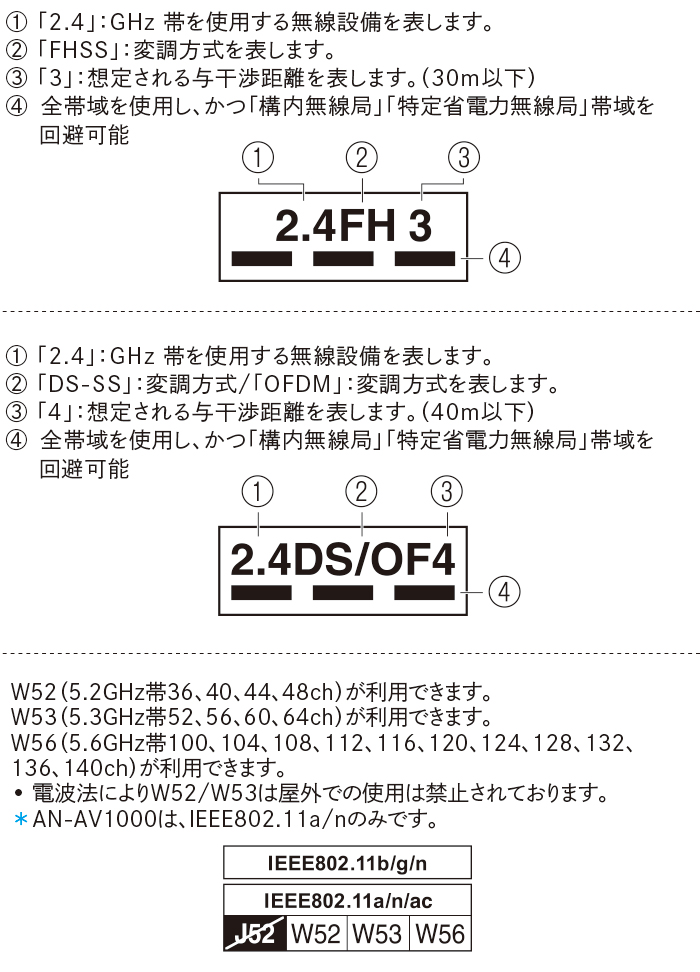 ●本製品は、次の場所で使用しないでください。ノイズが出たり、送信/受信ができなくなる場合があります。本機と同じ周波数帯(2.4GHz/5GHz)を利用する無線通信機器であるBluetooth®(本機と接続する機器を除く)、無線LAN、また電子レンジなどの機器の磁場、静電気、電波障害が発生するところ(環境により電波が届かない場合があります)。 ●この機器の使用周波数帯域では、電子レンジなどの産業・科学・医療機器のほか、工場の製造ラインなどで使用される移動体識別用の構内無線局(免許を要する無線局)および特定小電力無線局(免許を要しない無線局)、ならびにアマチュア無線局(免許を要する無線局)が運用されています。 ●この機器を使用する前に、近くで移動体識別用の構内無線局および特定小電力無線局ならびにアマチュア無線局が運用されていないことを確認してください。 ●万一、この機器から移動体識別用の構内無線局に対して有害な電波干渉の事例が発生した場合には、すみやかに場所を変更するか、または電波の使用を停止したうえ、お客様ご相談窓口にご連絡いただき、混信回避のための処置など(例えば、パーティションの設置など)についてご相談してください。 ●その他、この機器から移動体識別用の特定小電力無線局あるいはアマチュア無線局に対して有害な電波干渉の事例が発生した場合など何かお困りのことが起きたときは、お客様ご相談窓口へお問い合わせください。 ●製品に貼られているラベルの見かたは次の通りです。