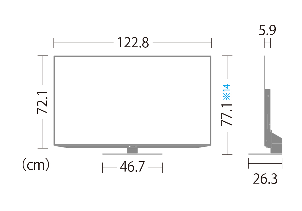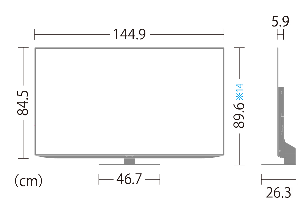 | 外形寸法 幅×奥行×高さ(cm)※13 | (1)144.9×26.3×89.6※14/スタンド幅:46.7 (2)144.9×5.9×84.5 | ||