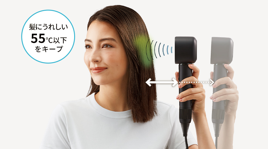 髪との距離をセンシングし、ドライヤーを近づけても髪が熱くなりすぎないよう風の温度をコントロールします。 - 【BEAUTY】モード