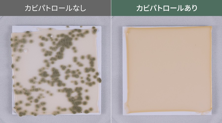 1枚目:カビパトロールイメージ、2枚目:パトロールありとパトロールなしの黒カビ比較実験