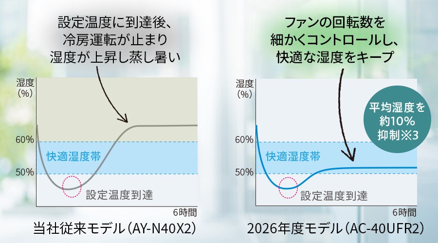 冷房運転中は設定温度に到達すると冷房運転を弱めるため、十分な除湿ができず湿度が上がってしまうことがあります。 匠の冷房はファンの回転数を細かく制御、熱交換器の温度を調整することで、温度はもちろん湿度までコントロールし、サラッと快適な冷房を実現します。