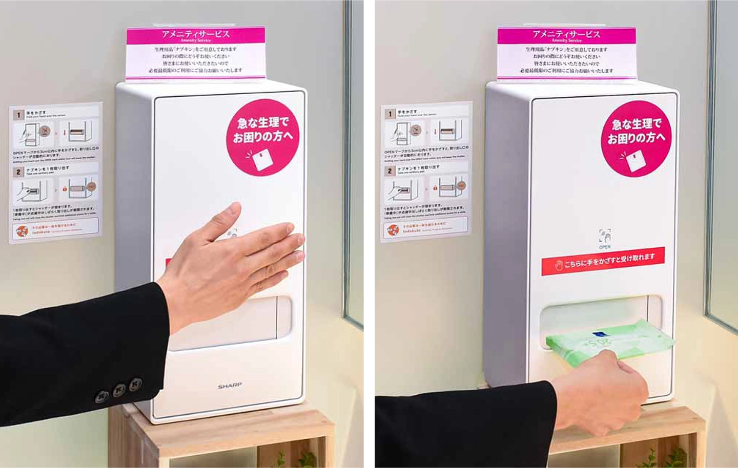 前面に手をかざすだけで、生理用ナプキンを1枚取り出せる