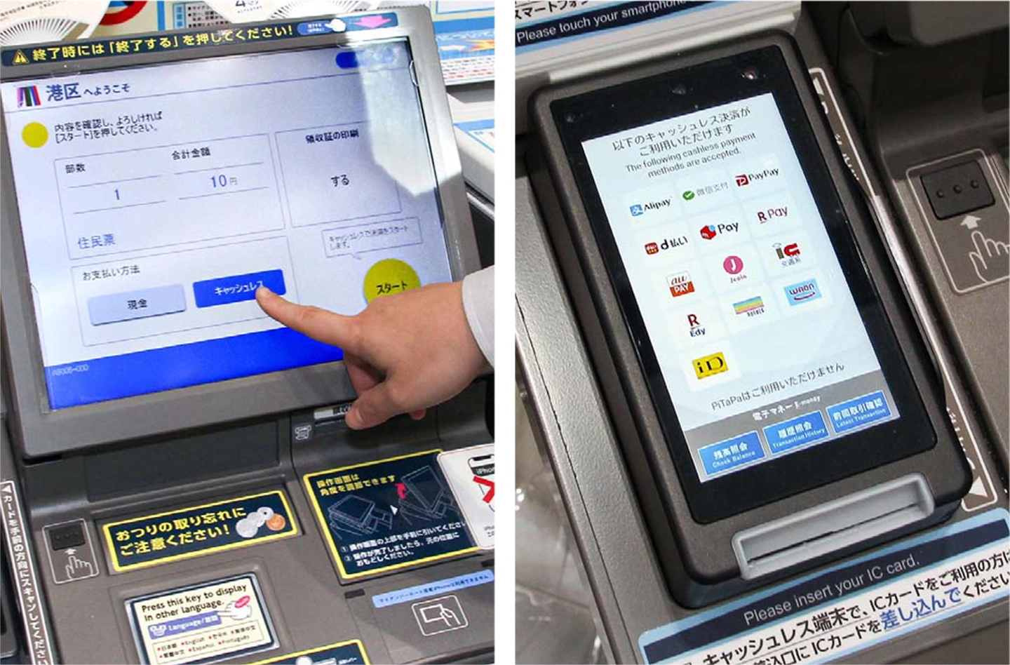 タッチ画面でキャッシュレスを選び、決済端末で利用サービスを選択