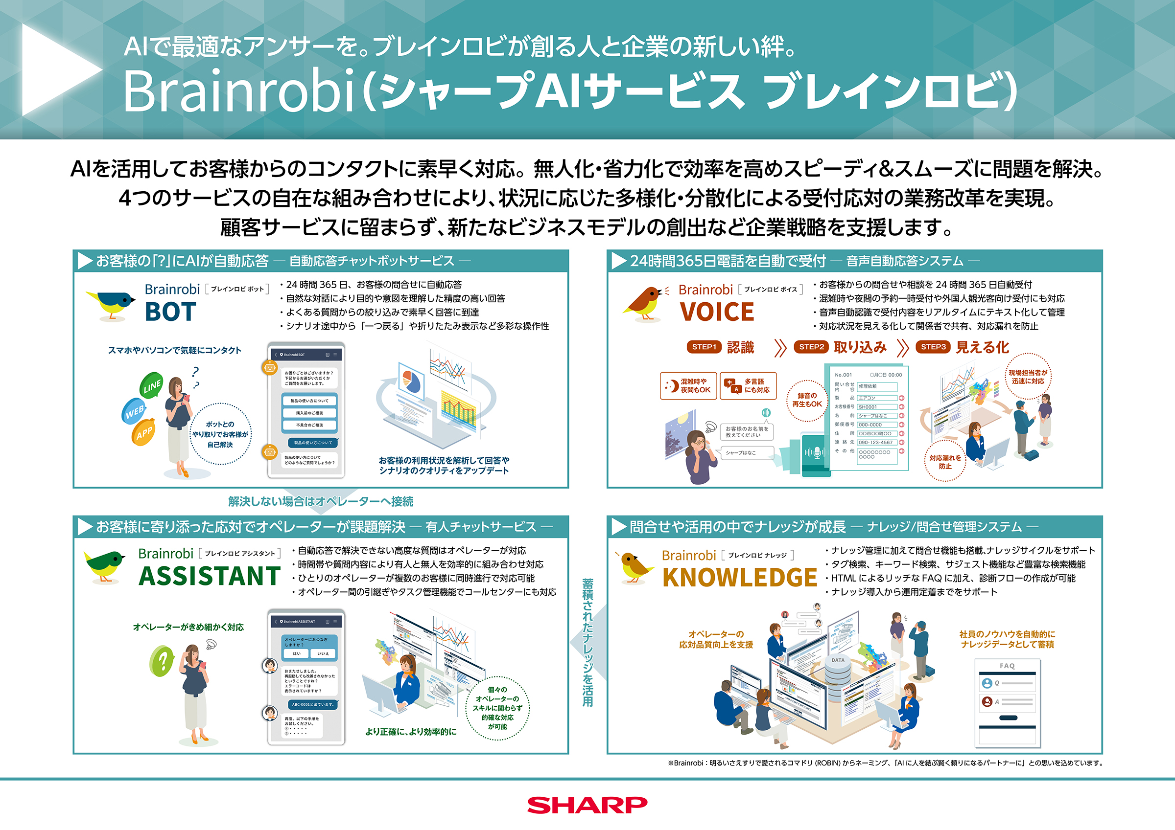 法人のお客様 TOP SHARP BUSINESS SOLUTION ONLINE シャープAI サービス「Brainrobi(ブレインロビ)」 SHARP BUSINESS SOLUTION ONLINE SHARP BUSINESS FORUM ONLINE 商品・ソリューションのご紹介 シャープAI サービス「Brainrobi(ブレインロビ)」 製品紹介動画視聴 実演販売士動画視聴 関連セミナー動画視聴 製品サイト 導入事例 カタログ 提案書 お問い合わせ ・会社名、製品名等の固有名詞は各社の商標または登録商標です。 SHARP BUSINESS SOLUTION ONLINE トップへ戻る ページのトップへ戻る