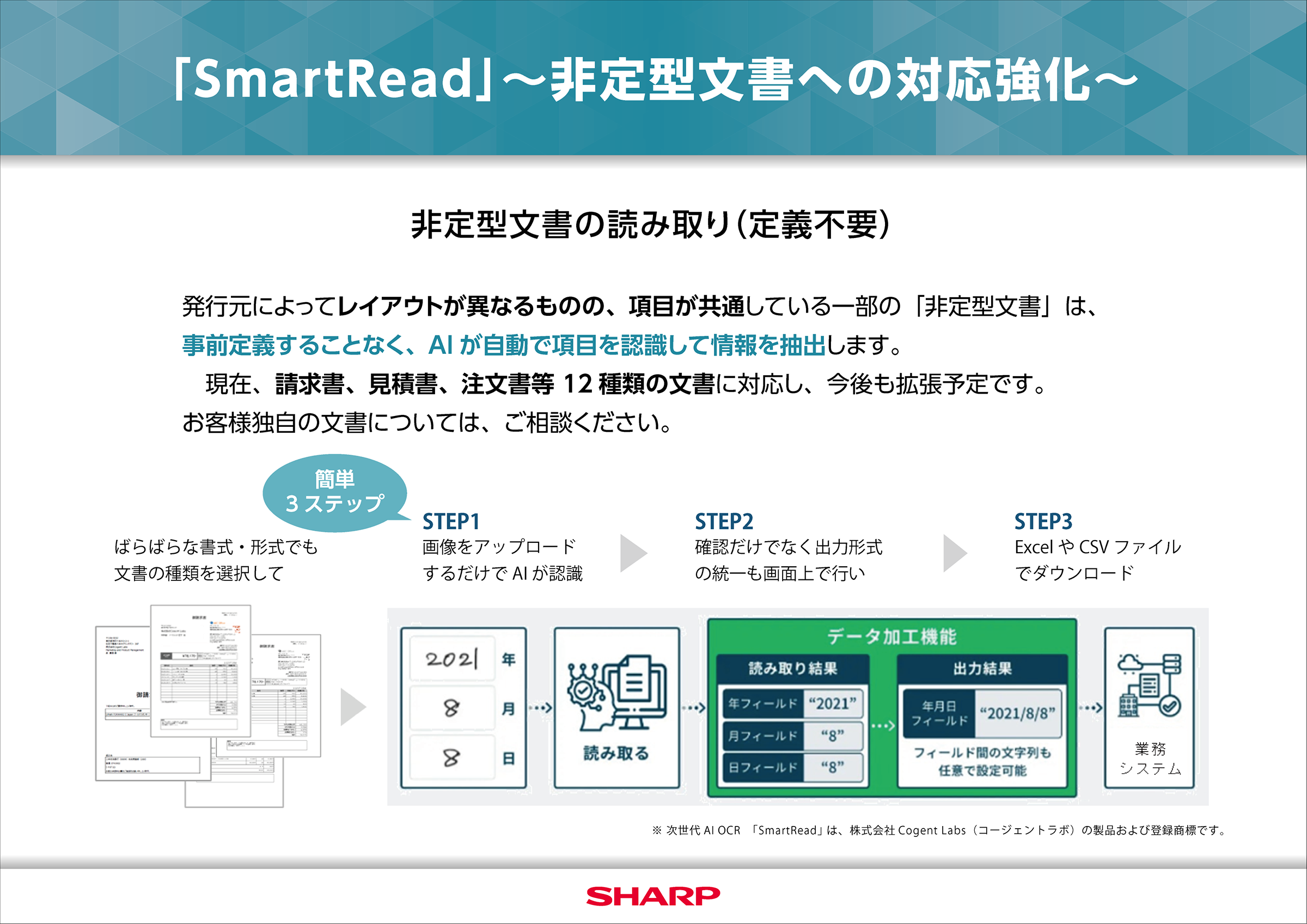 次世代AI OCR「SmartRead」は、株式会社Cogent Labs(コージェントラボ)の製品および登録商標です。