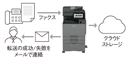 ファクス受信データをクラウドストレージへ転送することで外出先やテレワークなどの遠隔地でも簡単に確認できます。また、転送結果はメールでも通知されます。