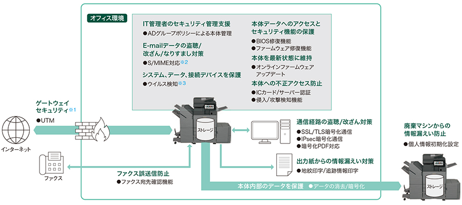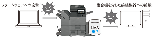 Bitdefender社のスキャンエンジンを利用したウイルス検知機能を搭載。ウイルスやマルウェアなどを使用した多様化する複合機への攻撃や、NAS※2機能を踏み台とした複合機に接続している機器へのウイルスの拡散からオフィスを保護します。