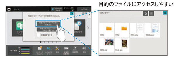 コピーやプリントのデータを本体のストレージの一時保存フォルダーに保存可能。ファイルを指定するだけですばやく再印刷できます。