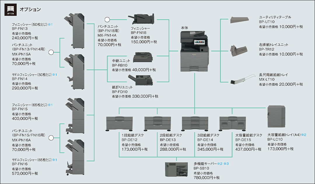 • ※1オプションの給紙デスク(BP-DE12/DE13/DE14/DE15)のいずれかと中継ユニット(BP-RB10)、もしくは紙折りユニット(BP-FD10)が必要です。