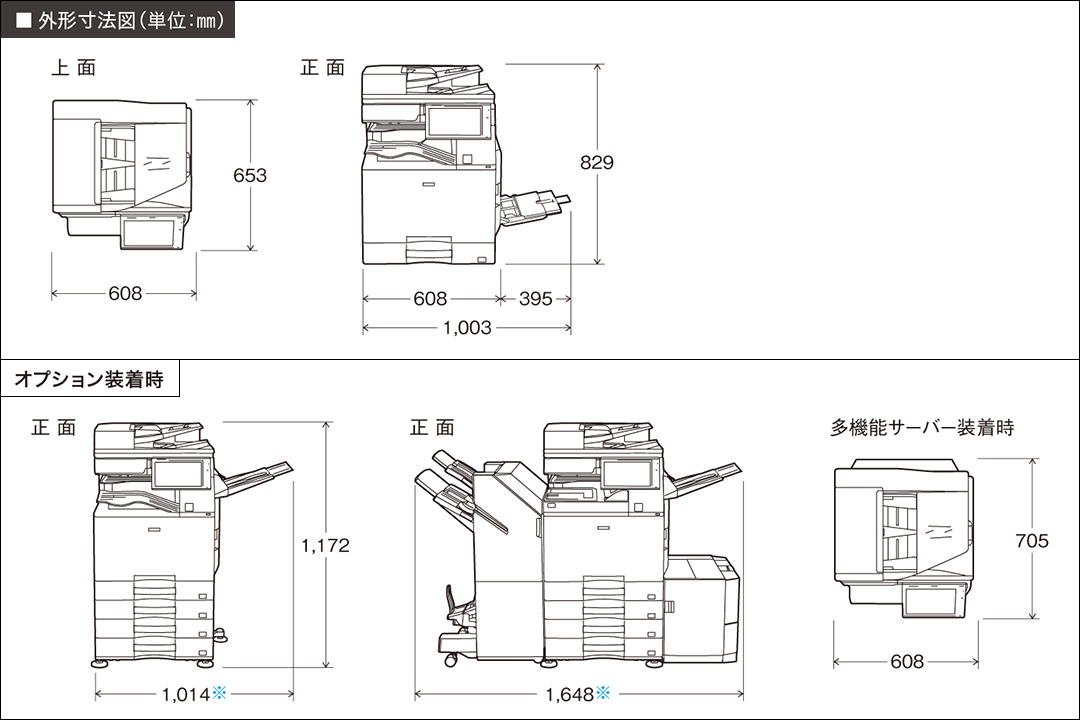 排紙トレイ引き出し時:幅635×奥行623×高さ1,049mm