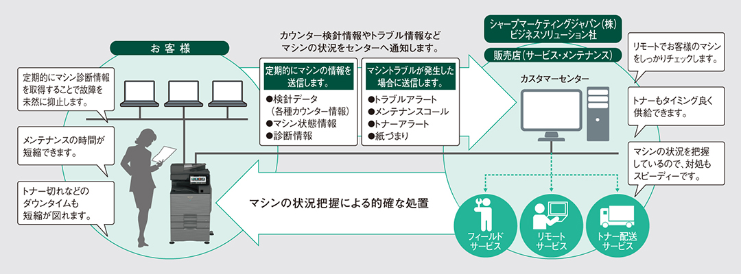 デジタル複合機のサービスやメンテナンスをもっと効率化したい。そのために生まれたのがシャープパワーネットシステムです。通信環境を利用して、遠隔で稼働状況を監視。事前にトラブル内容を把握でき、すばやい対応が可能です。また、安心してご利用いただけるよう、接続する通信方式に合わせて、適切なセキュリティ設定を実施しています。