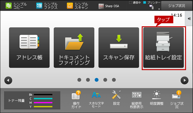 ※ [給紙トレイ設定]ボタンがトップページにない場合は、ホーム画面を右にスクロールします。