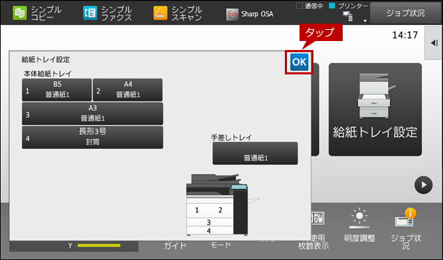 6.「給紙トレイ]画面にもどりますので、給紙トレイ4の「用紙サイズ」を確認して、[OK]をタップします。
