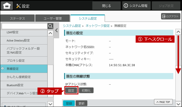 5. 設定後、ページを下へスクロールして、「現在の無線状態」の[設定]をタップします。