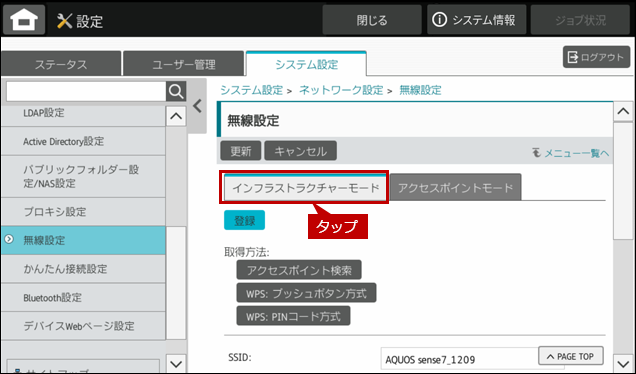 複合機の無線設定で「インフラストラクチャーモード」に設定します。