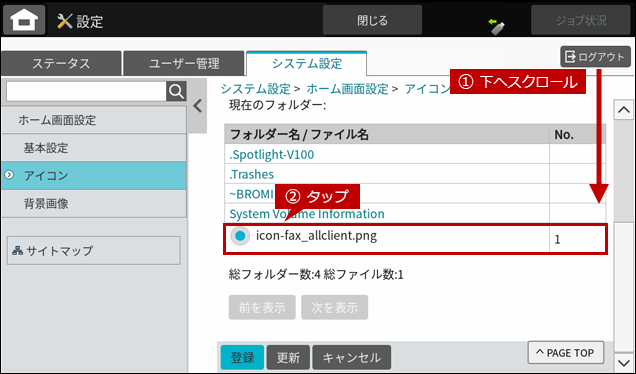 アイコン画像は事前に作成し、USBメモリーに保存してある状態で操作します。