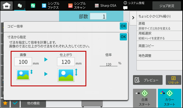 原稿サイズと用紙サイズが決まっている場合、画像寸法指定により倍率を設定することができます。