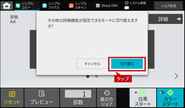 3. 「その他の詳細機能が設定できるモードに切り替えますか?」と表示されますので、[切り替え]をタップします。