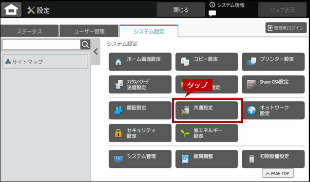2. 「システム設定」画面が表示されますので、[共通設定]をタップします。