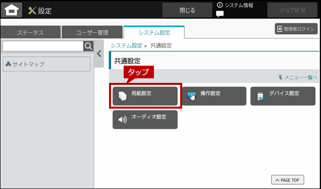 3. 「共通設定」画面が表示されますので、[用紙設定]をタップします。