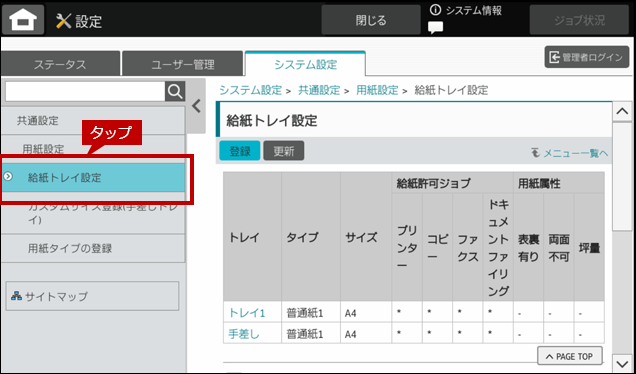 4. 「共通設定」メニューの[給紙トレイ設定]をタップします。