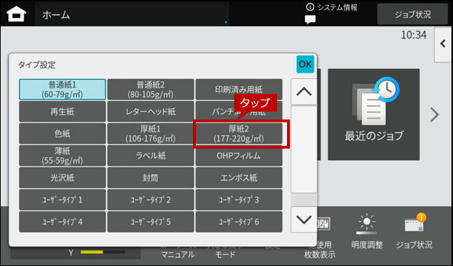 3.「タイプ設定」画面が表示されますので、[厚紙2]をタップします。