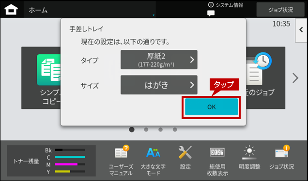 6. 「手差しトレイ」の設定画面に戻りますので、[OK]をタップします。