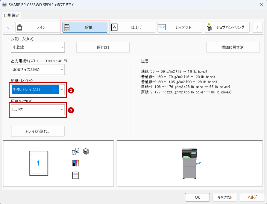 9. 次にプリンタードライバー設定画面で[給紙]タブをクリックし、給紙トレイと用紙タイプを設定します。