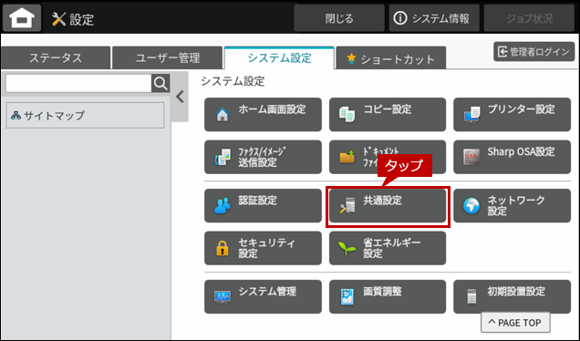 2. 「システム設定」画面が表示されますので、[共通設定]をタップします。