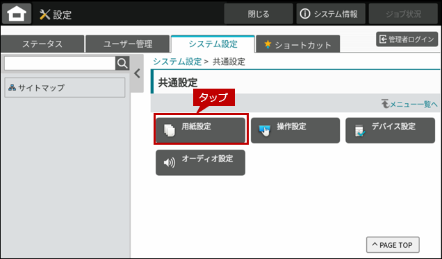 3. 「共通設定」画面が表示されますので、[用紙設定]をタップします。