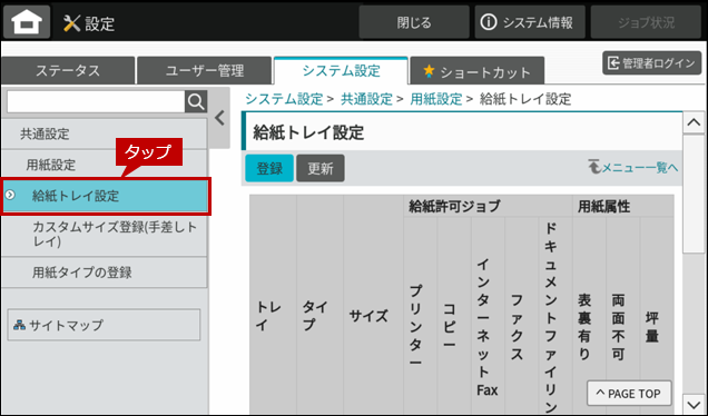 4. 「共通設定」メニューの[給紙トレイ設定]をタップします。