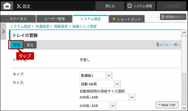 6. 上記で選択したトレイの「トレイの登録」画面が表示されますので、変更したい項目を変更し、[登録]をタップします。(※設定できるタイプとサイズについては、下記の「各トレイに設定できる用紙タイプと用紙サイズ」をご覧ください。)
