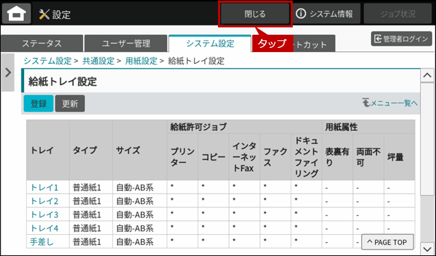 7. 「給紙トレイ設定」画面に戻りますので、[閉じる]をタップしてします。