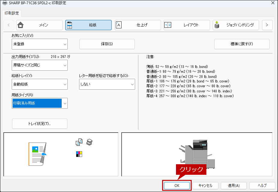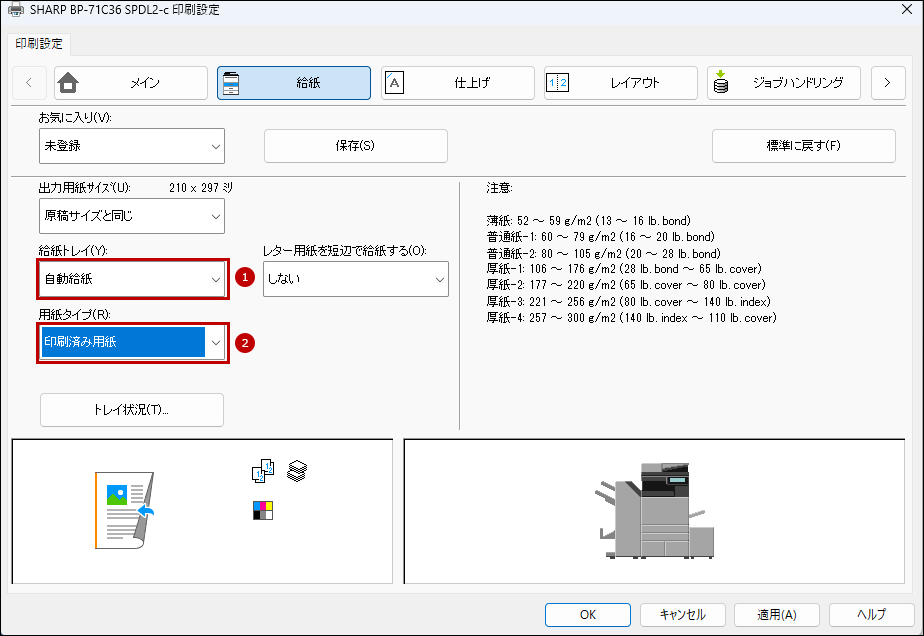 11.プリンタードライバー設定画面で [給紙]タブをクリックし、給紙トレイと用紙タイプを設定します。