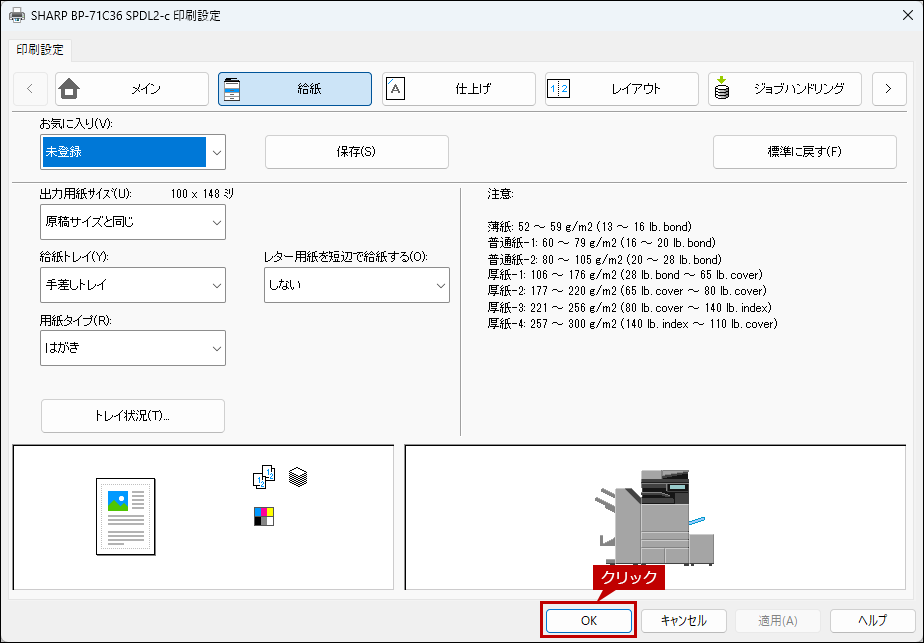 5. 次にプリンタードライバー設定画面で[給紙]タブをクリックし、給紙トレイと用紙タイプを設定します。