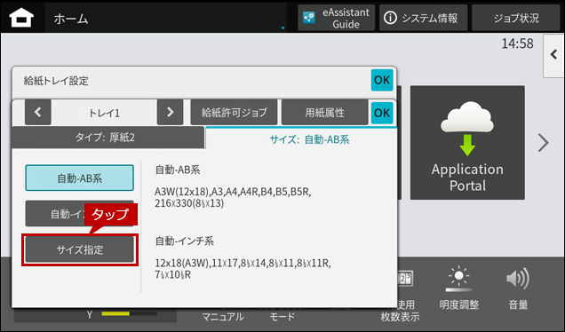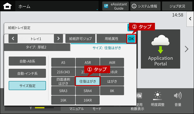 2. 往復はがきをセットしますとホーム画面に「手差しトレイ」の自動検知画面が表示されますので、「用紙サイズ」をタップします。