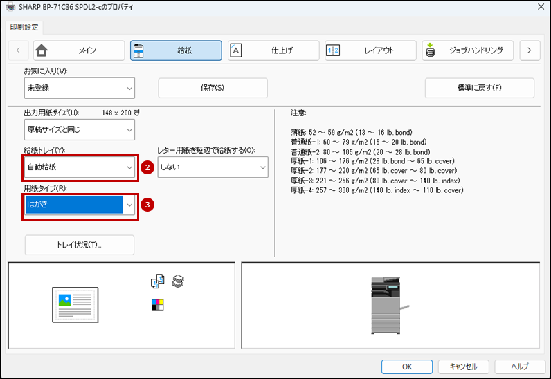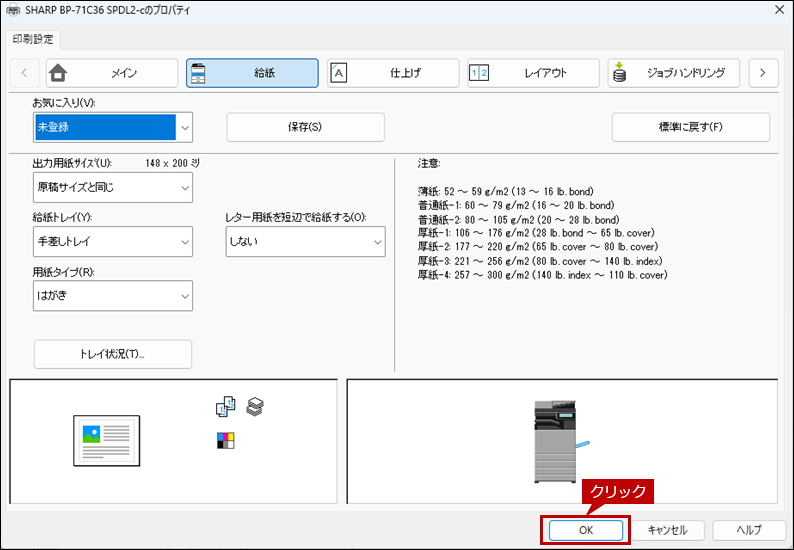 8. 次にプリンタードライバー設定画面で[給紙]タブをクリックし、給紙トレイと用紙タイプを設定します。