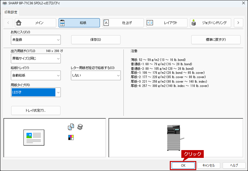 9. プリンタードライバー設定画面で[OK]をクリックして、印刷を実行します。