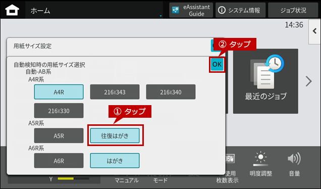 4.「自動検知時の用紙サイズ選択」画面が表示されますので、A5R系の[往復はがき]をタップして[OK]をタップします。