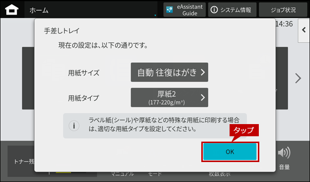 5.「手差しトレイ」の自動検知画面にもどりますので、用紙サイズが変更されていることを確認して、[OK]をタップします。