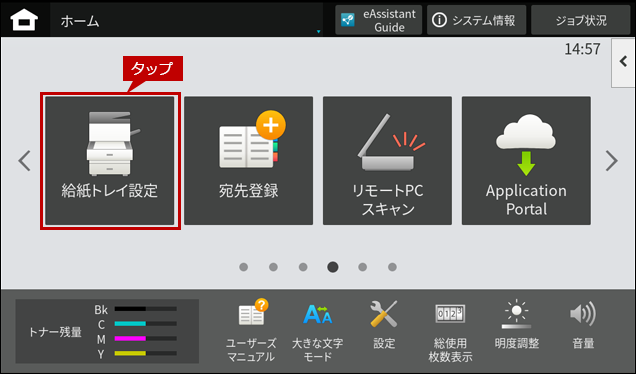 ※ [給紙トレイ設定]ボタンがトップページにない場合は、ホーム画面を右にスクロールします。