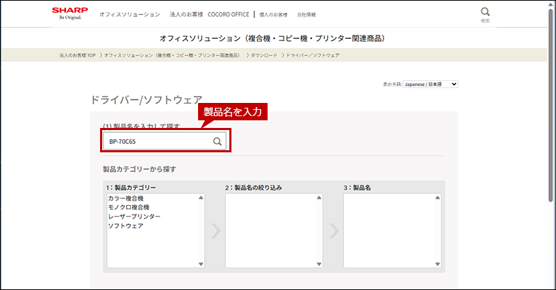 ドライバーのダウンロードページ にて、製品名を入力します。