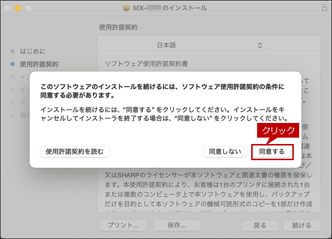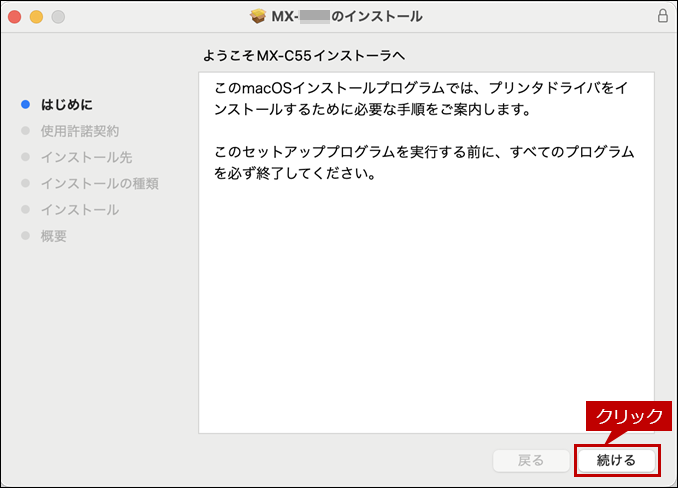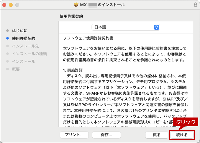 表示された「ソフトウェア使用許諾契約書」を確認し、[続ける]ボタンをクリックします。