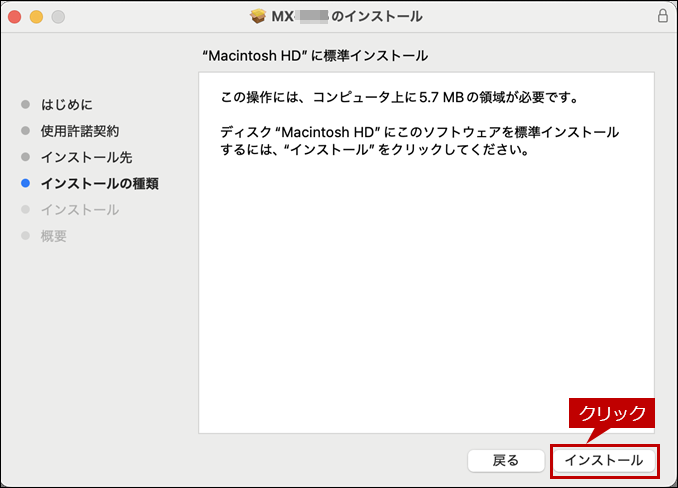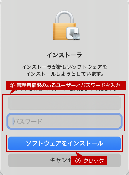 Mac OSの管理者権限のあるユーザ名とパスワードを入力し、[ソフトウェアをインストール]ボタンをクリックします。