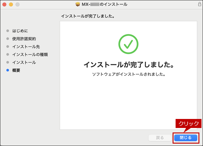 インストールの完了画面が表示されたら、[閉じる]ボタンをクリックしてください。
