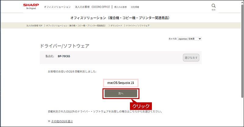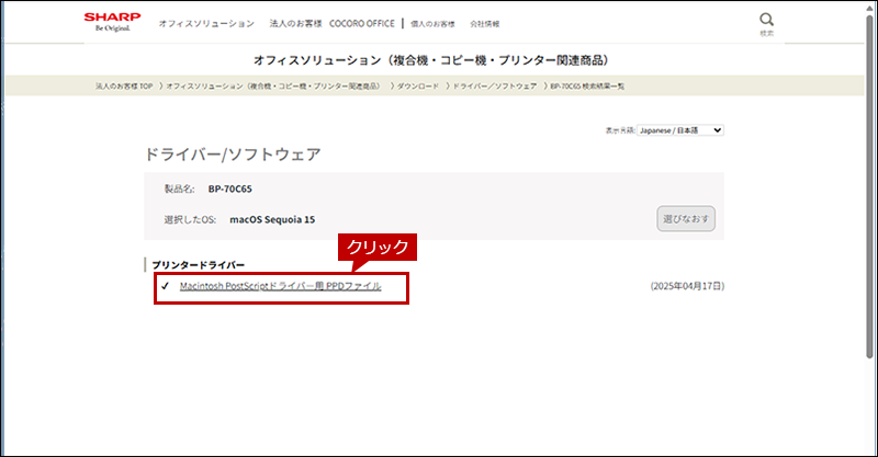 ダウンロード可能なドライバーの一覧が表示されますので、プリンタードライバーをクリックします。