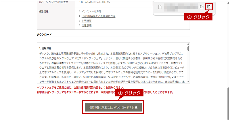 [使用許諾に同意の上、ダウンロードする]ボタンをクリックし、表示されたウィンドウにある[開く]ボタンをクリックします。