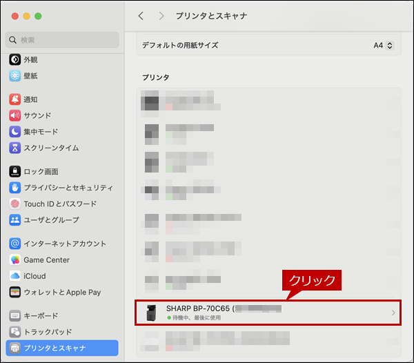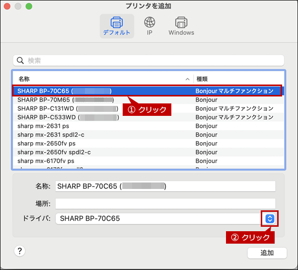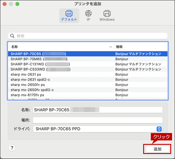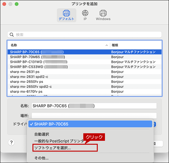追加した複合機(例:SHARP BP-70C65)をクリックします。